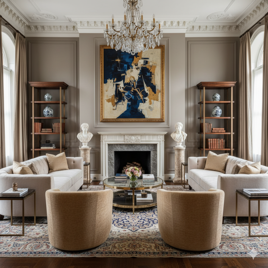 - The Public Salon (The Living Room/Drawing Room): As the primary gathering space, this room is analogous to the historic State Drawing Room. The layout should be arranged to facilitate conversation, typically with symmetrical seating groups oriented around a clear focal point, such as a grand fireplace or a major work of art .