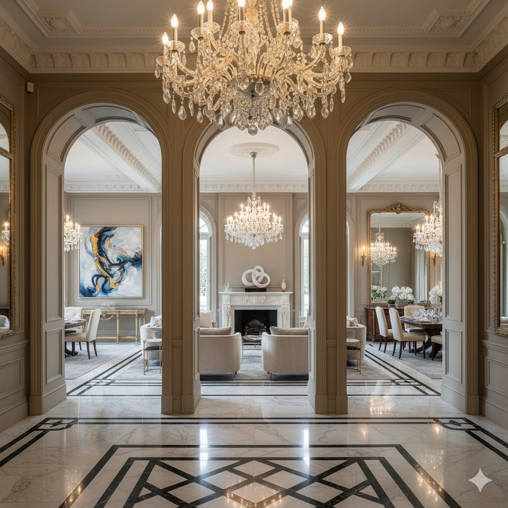 - The Grand Reception (The Foyer/Hall): This is the modern antechamber, the first point of impression. The classic interior design should be bold and welcoming, establishing the home’s aesthetic with a statement floor (e.g., marble with an inlaid pattern), a sculptural chandelier, a significant piece of art, or a commanding console table.